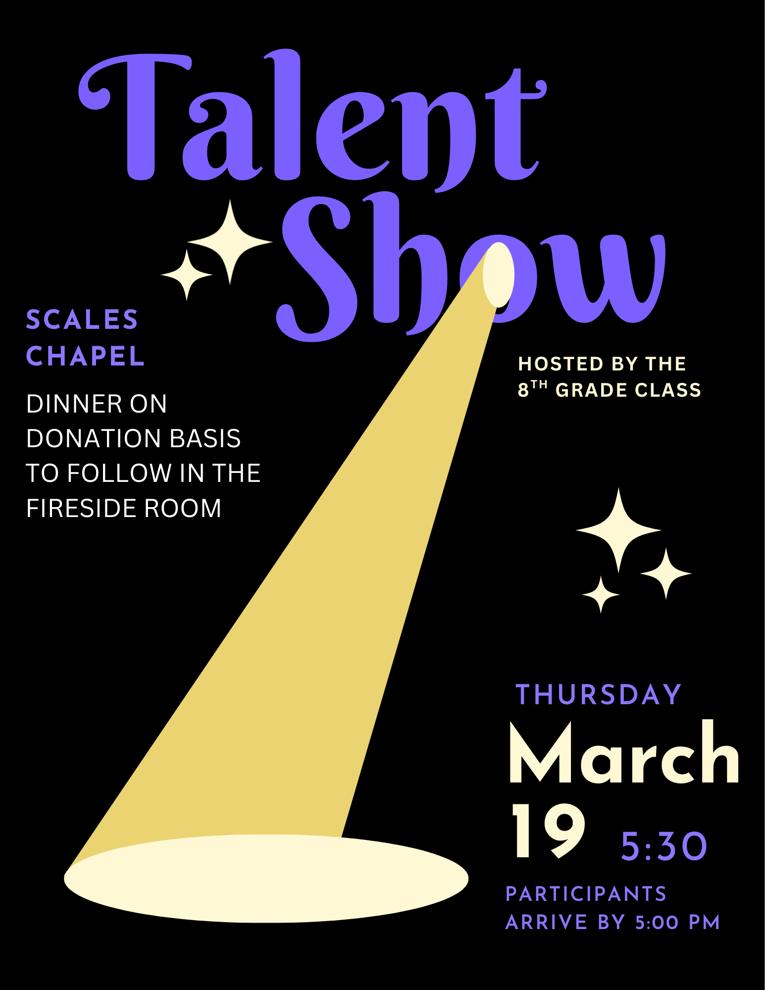 Our annual Talent Show and Spaghetti Dinner is coming up on Thursday, March 19. The Talent Show will begin at 5:30 PM in Scales Chapel. Participants need to arrive at 5:00 PM.